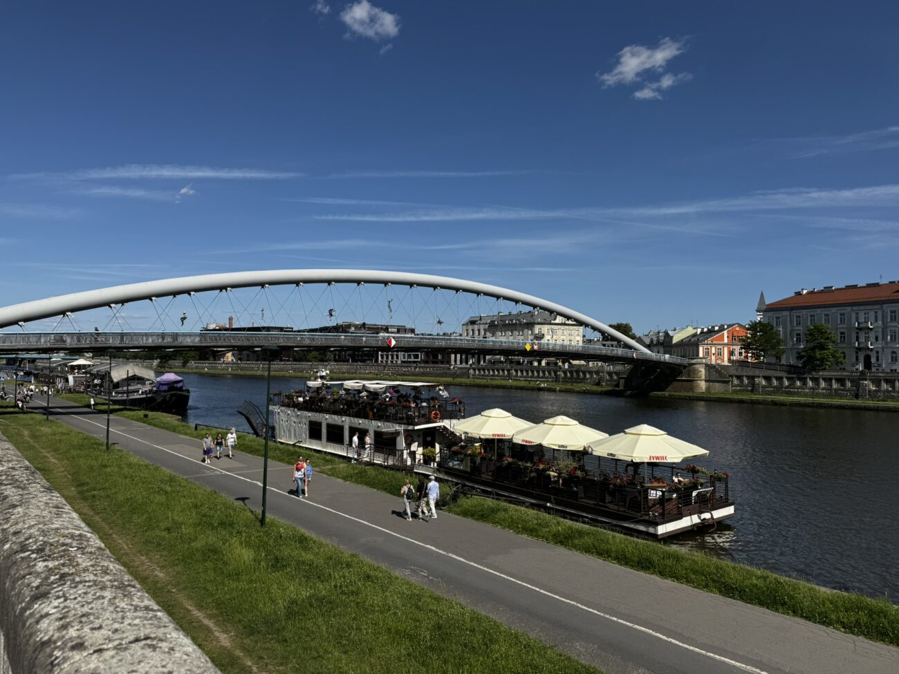 Nach dem kreativen Gewirr Kazimierz lohnt ein Spaziergang über die Weichsel – denn auf der anderen Seite liegt Podgórze, ein Viertel, das sich in den letzten Jahren zum künstlerischen Geheimtipp entwickelt hat. Über die futuristische Kładka Bernatka, eine elegante Fußgängerbrücke, die mit tänzerischen Skulpturen geschmückt ist, gelangt man nach Podgórze. Früher gehörte der Ort übrigens zu Österreich.