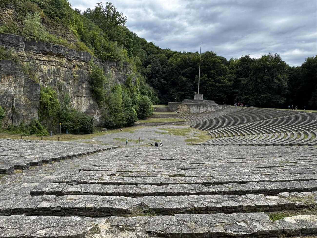Die halbkreisförmige Arena ist eingebettet in eine 35 Meter hohe Kalksteinwand. Die Tribünen bieten Platz für bis zu 50000 Menschen – eine monumentale Dimension, die in der stillen Landschaft fast surreal wirkt.