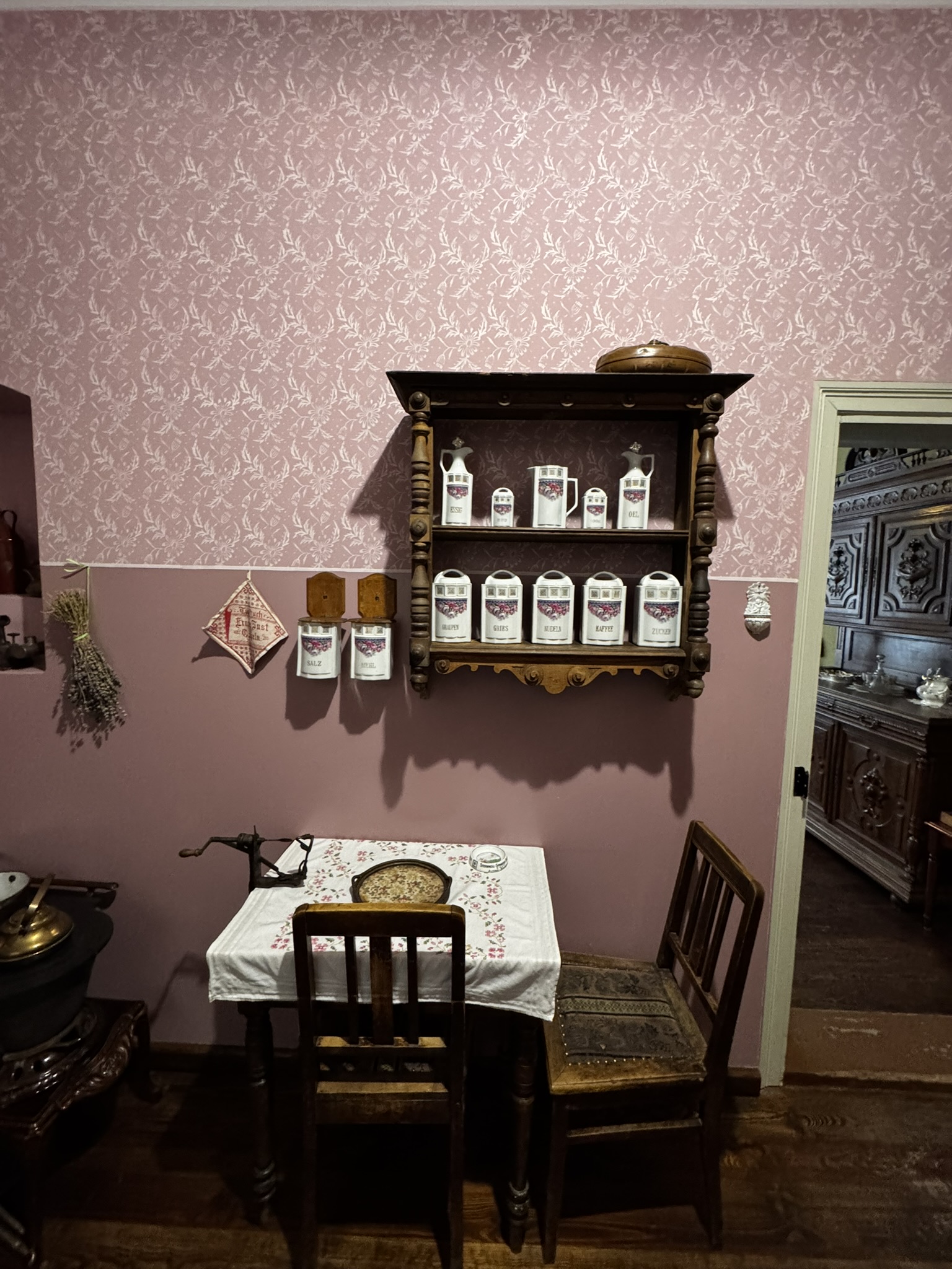 Schon beim Betreten des Treppenhauses spürt man die Atmosphäre: knarrende Dielen, ein gusseisernes Geländer, der Duft von Holz und Geschichte. Die Räume sind originalgetreu eingerichtet – vom Wohnzimmer mit schweren Möbeln und Spitzendeckchen bis zur Küche mit Emailletöpfen, Kohleherd und Vorratsdosen mit der deutschen Aufschrift Gries, Mehl oder Salz. In der Speisekammer hängen Würste, und auf dem Tisch liegt ein handgeschriebenes Rezeptbuch. Es ist, als hätte die Bewohnerin gerade das Haus verlassen, um auf dem Markt frisches Gemüse zu holen.